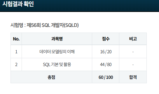 딱 컷트라인으로 SQLD 드디어 합격! 오늘 아침에 출근하면서도 아. 사전점수 확인기간에 점수를 확인해서.. 딱 컷트라인 합격인 거 다시 생각하니 미소가 지어졌는데. 이렇게 진짜 합격이라고 뜨니까 기부니가 좋습니다:) 이번에 좀 어려웠다고 느꼈기 때문에 불합격일 수도 있겠다 싶었는데. 하나를 이렇게 치렀습니다ㅎ.ㅎ 제 51회, 제 53회, 제 56회 SQLD 시험을 응시하고 56회로 종지부를 찍었습니다. 늘 벼락치기만 해서.. 직무랑 관련이 있으니 공부목적으로 하는데에도 의미가 있어서 엄청 스트레스 받거나 이러진 않고 될 때까지 그냥 신청해야지 했는데! 막상 되니 기부니 좋다 헤헤. ADSP, SQLD 취득했으니 이제 DASP 결과 기다리고..진심으로 빅분기는 1도 공부를 안했지만.. 내일 시험은 치..